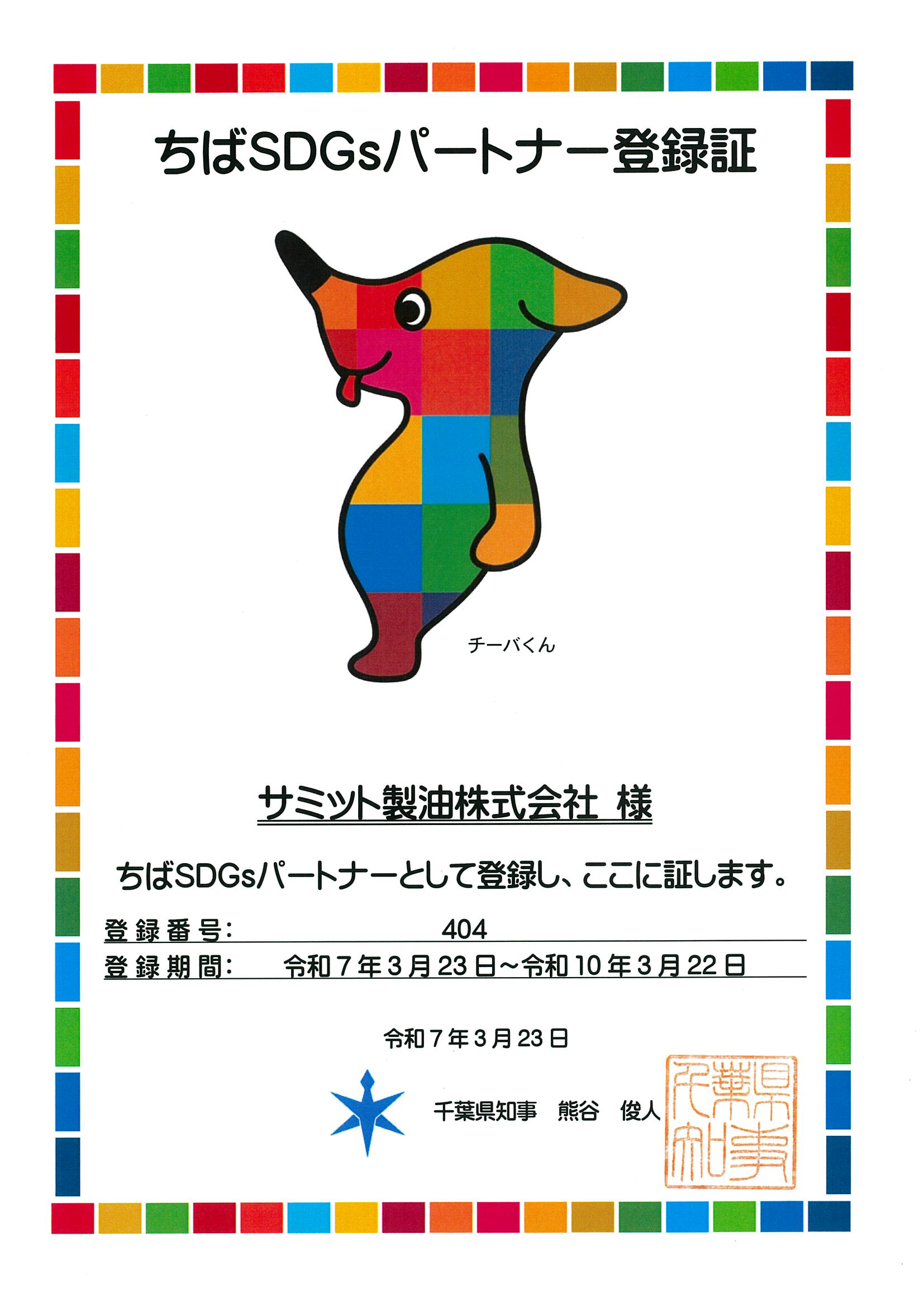 サミット製油株式会社は、千葉県が実施している「ちばSDGsパートナー登録制度」の更新を行いました。「初回登録:2022年3月」